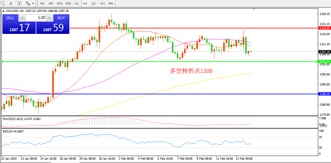 4小时图看,金价在近期处于明显的震荡走势之中,1300-1320将是下一阶段主要的运行区间,均线系统走平,区间上下沿高抛低吸为合理策略。