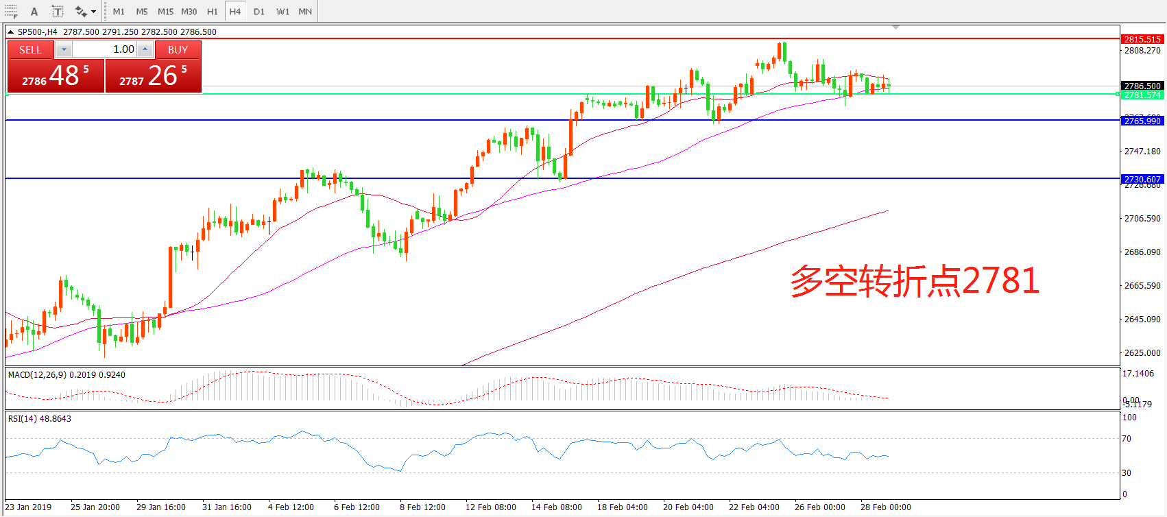4小时图看,SP500高位震荡后振幅逐渐收窄,21均线与55均线逐渐粘合,MACD红柱减少,RSI指标走平,重点关注2781一线支撑。