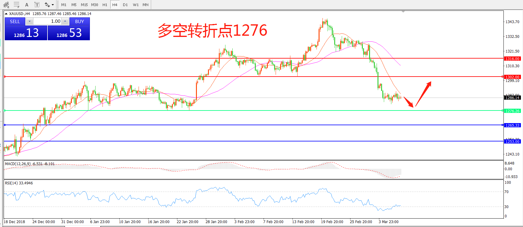 4小时图看,金价跌破1302撑后维持低位盘整态势,21均线逐渐下压形成阻力,但形态上已经出现筑底迹象,MACD绿柱缩短,RSI指标掉头走平,日内存在小幅反弹可能。