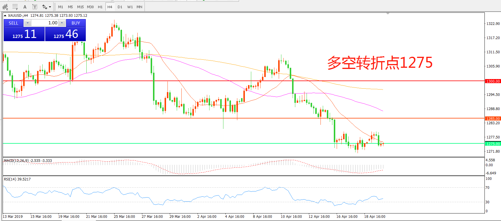 4月22日周一,日内稍早公布的美国3月成屋销售数据大幅下滑4.9%,远不及前值,也逊于预期。多个国家适逢假期休市,市场交投清淡。因美国对伊朗制裁的力度加大,避险情绪有所回升,现货黄金周一小幅下挫,收报1275.22美元/盎司.