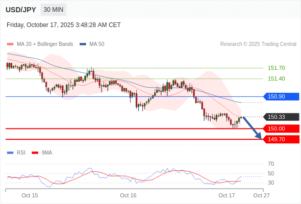 在 150.90 之下,看跌,目标价位为 150.00 ,然后为 149.70 。