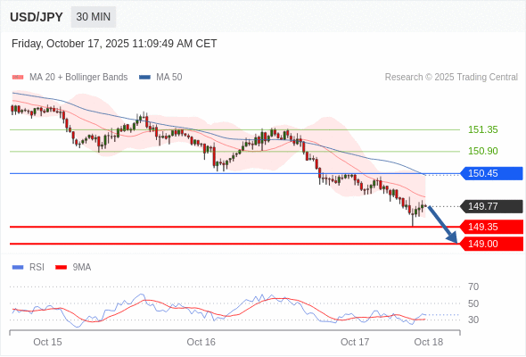 在 150.45 之下,看跌,目标价位为 149.35 ,然后为 149.00 。