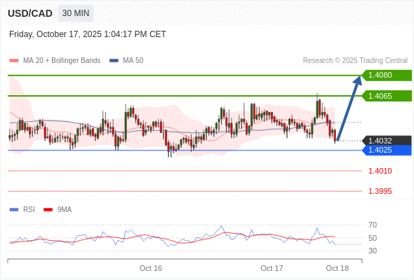 在 1.4025 之上,看涨,目标价位为 1.4060 ,然后为 1.4080 。