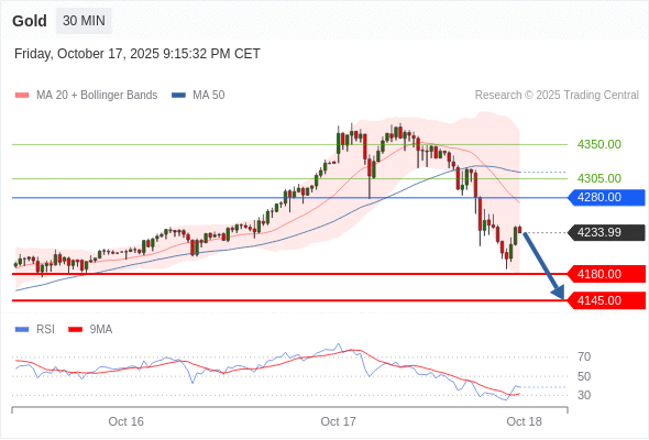在 4280.00 之下,看跌,目标价位为 4180.00 ,然后为 4145.00 。