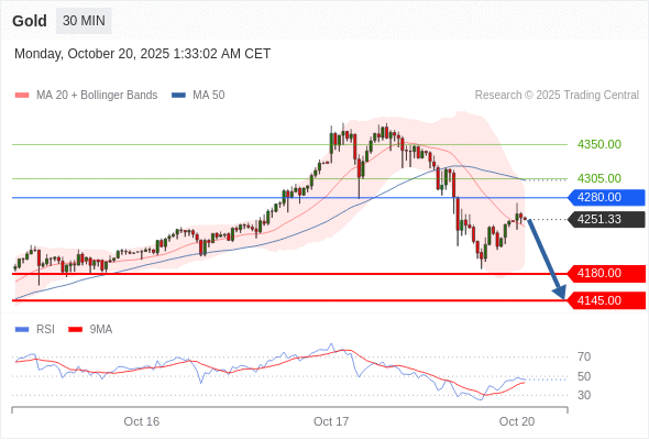 在 4280.00 之下,看跌,目标价位为 4180.00 ,然后为 4145.00 。