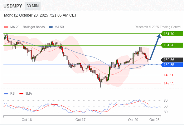 在 150.35 之上,看涨,目标价位为 151.20 ,然后为 151.70 。