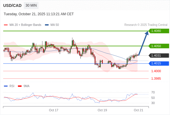 在 1.4015 之上,看涨,目标价位为 1.4050 ,然后为 1.4065 。