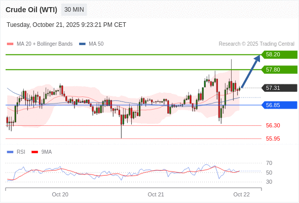 在 56.85 之上,看涨,目标价位为 57.80 ,然后为 58.20 。