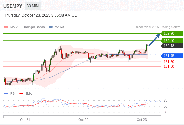 在 151.75 之上,看涨,目标价位为 152.40 ,然后为 152.70 。