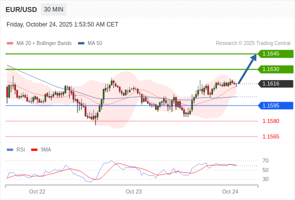 在 1.1595 之上,看涨,目标价位为 1.1630 ,然后为 1.1645 。