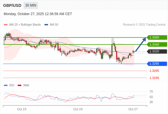 在 1.3285 之上,看涨,目标价位为 1.3340 ,然后为 1.3360 。