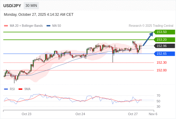 在 152.65 之上,看涨,目标价位为 153.20 ,然后为 153.50 。