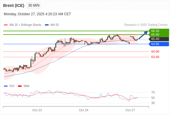在 64.85 之上,看涨,目标价位为 65.90 ,然后为 66.30 。