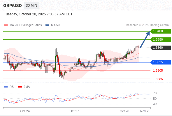 在 1.3325 之上,看涨,目标价位为 1.3380 ,然后为 1.3400 。