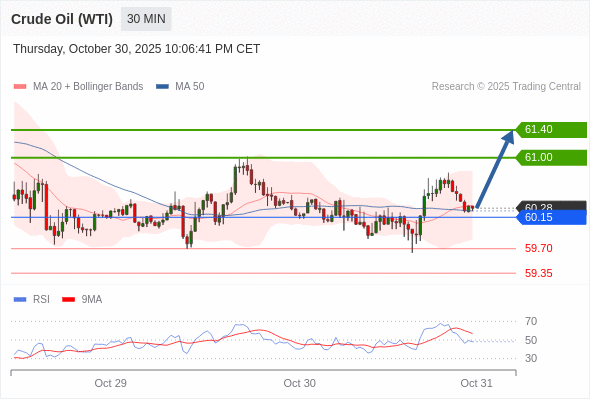 在 60.15 之上,看涨,目标价位为 61.00 ,然后为 61.40 。