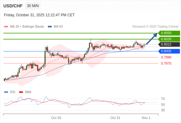 在 0.8005 之上,看涨,目标价位为 0.8035 ,然后为 0.8050 。