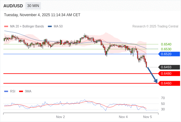 在 0.6520 之下,看跌,目标价位为 0.6480 ,然后为 0.6460 。