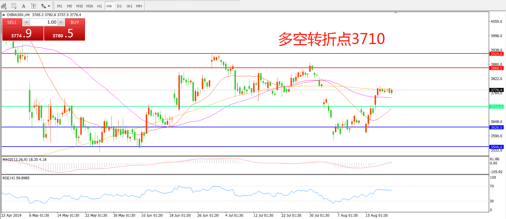 4小时图看,沪深300指数维持窄幅震荡,均线系统走平,形成下方支撑,MACD红柱减少,RSI指标向上,日内延续上行概率较大。