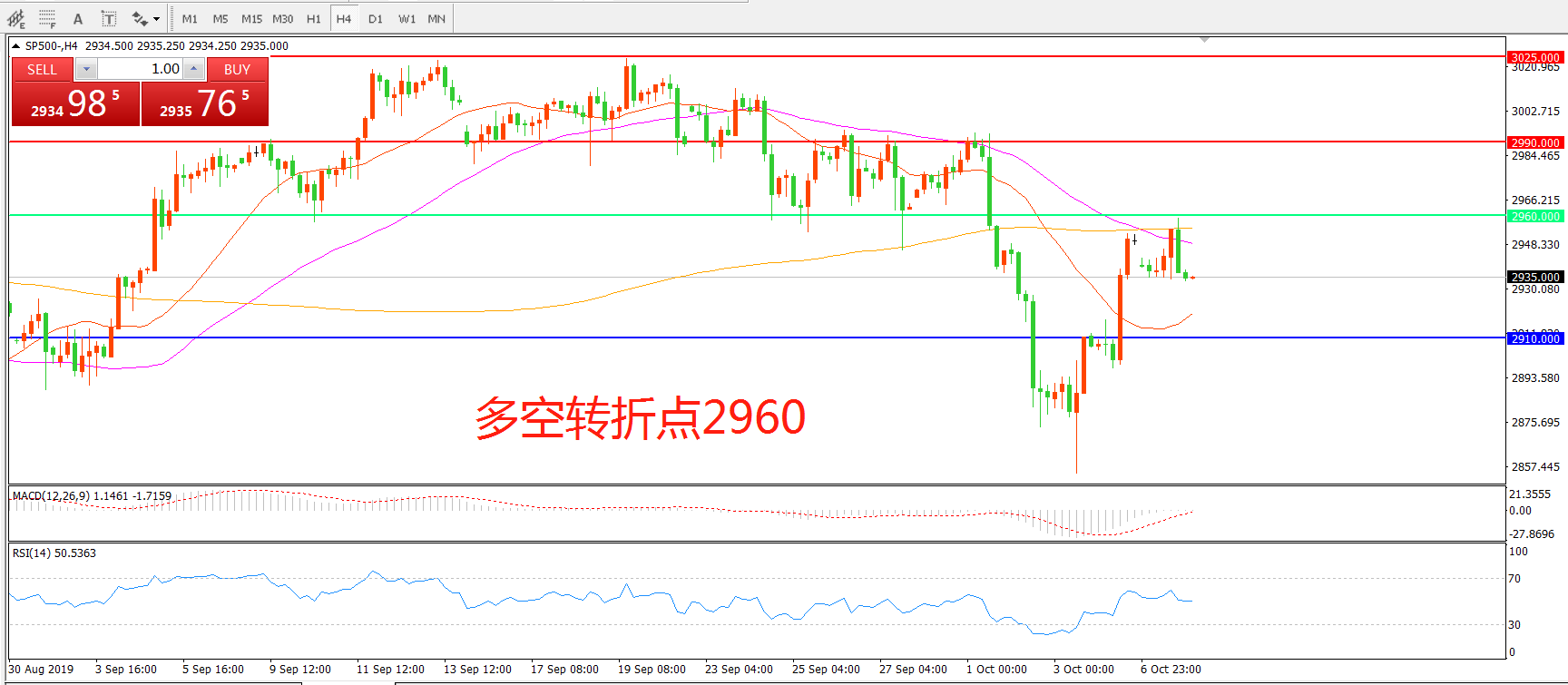 4小时图看,标普500冲高回落,2960成为短期阻力,均线系统走平,MACD绿柱缩短,RSI指标拐头向上,日内延续震荡较大。