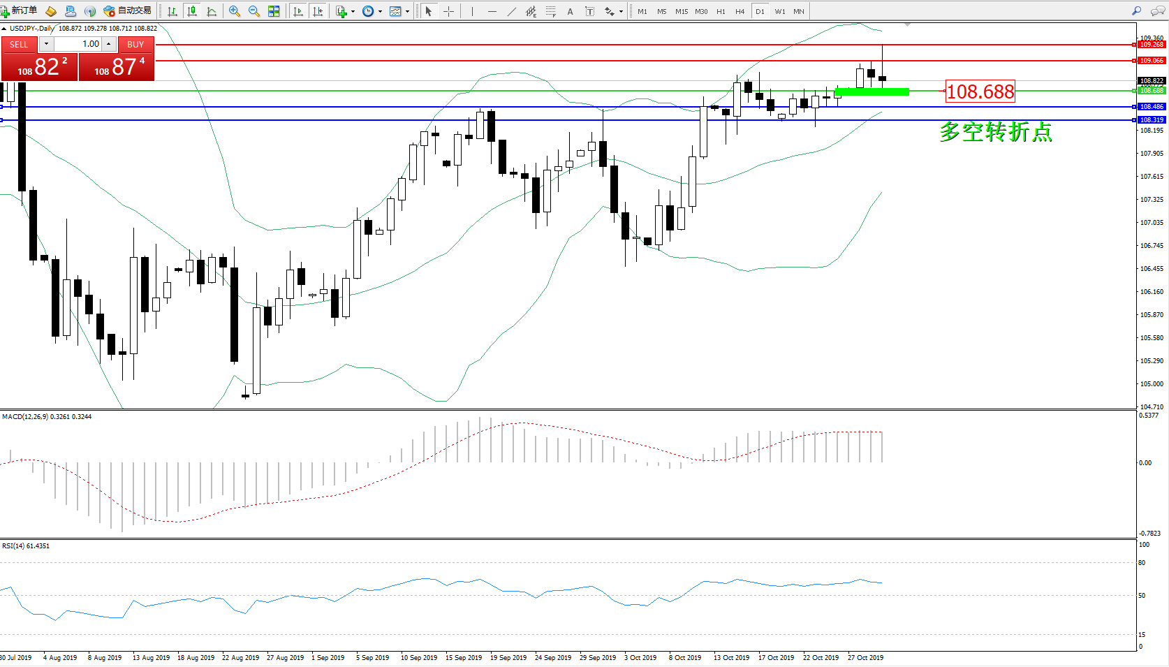 美元兑日元现报108.90,涨0.05%;据日经新闻:日本央行正考虑在1031日的利率决议中修改前瞻性指引,以更明确地暗示未来降息的可能性。美国三季度GDP同比增长1.9%,略低于二季度的2.0%,但明显强于市场观察者之前给出的1.6%这一悲观预测。这显示美国经济在旺盛消费活动的带动下仍保持韧性,缓冲了贸易和投资领域所遭遇的冲击。因此,经济并未录得预期中严重的失速;美联储宣布降息25个基点至1.5%-1.75%,为年内第三次降息,符合市场预期;在会后的政策声明中,美联储删除了“采取适当措施”的承诺。