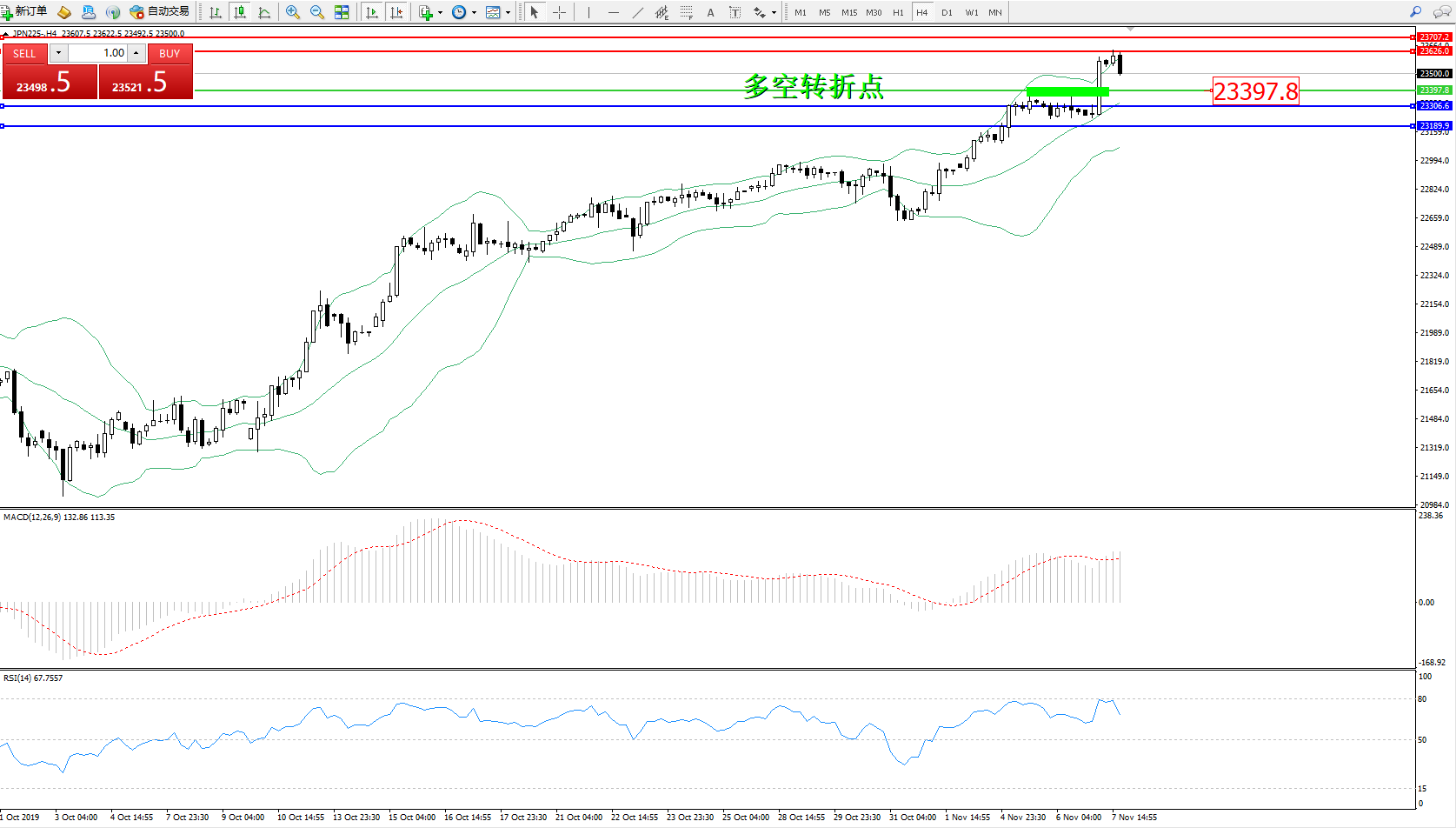 日经225指数11月7日(周四)收盘下跌2.32点,跌幅0.01%,报23301.50点。 日美两国国债走势几乎同步;关联度上升,经济不再进一步恶化的情况下日美两国央行看上去都倾向于维持利率不变,在这种背景下,两国基准国债的关联度上升到了一年多以来的最高水平。自9月底以来,10年期日本国债和美国国债收益率上涨的基点数几乎是一模一样。日本央行行长黑田东彦对于经济的相对乐观态度表明,接下来最有可能出现的情境是继续维持现有利率水平,日本央行势在进一步放松政策的市场预期已经因此而降温 。