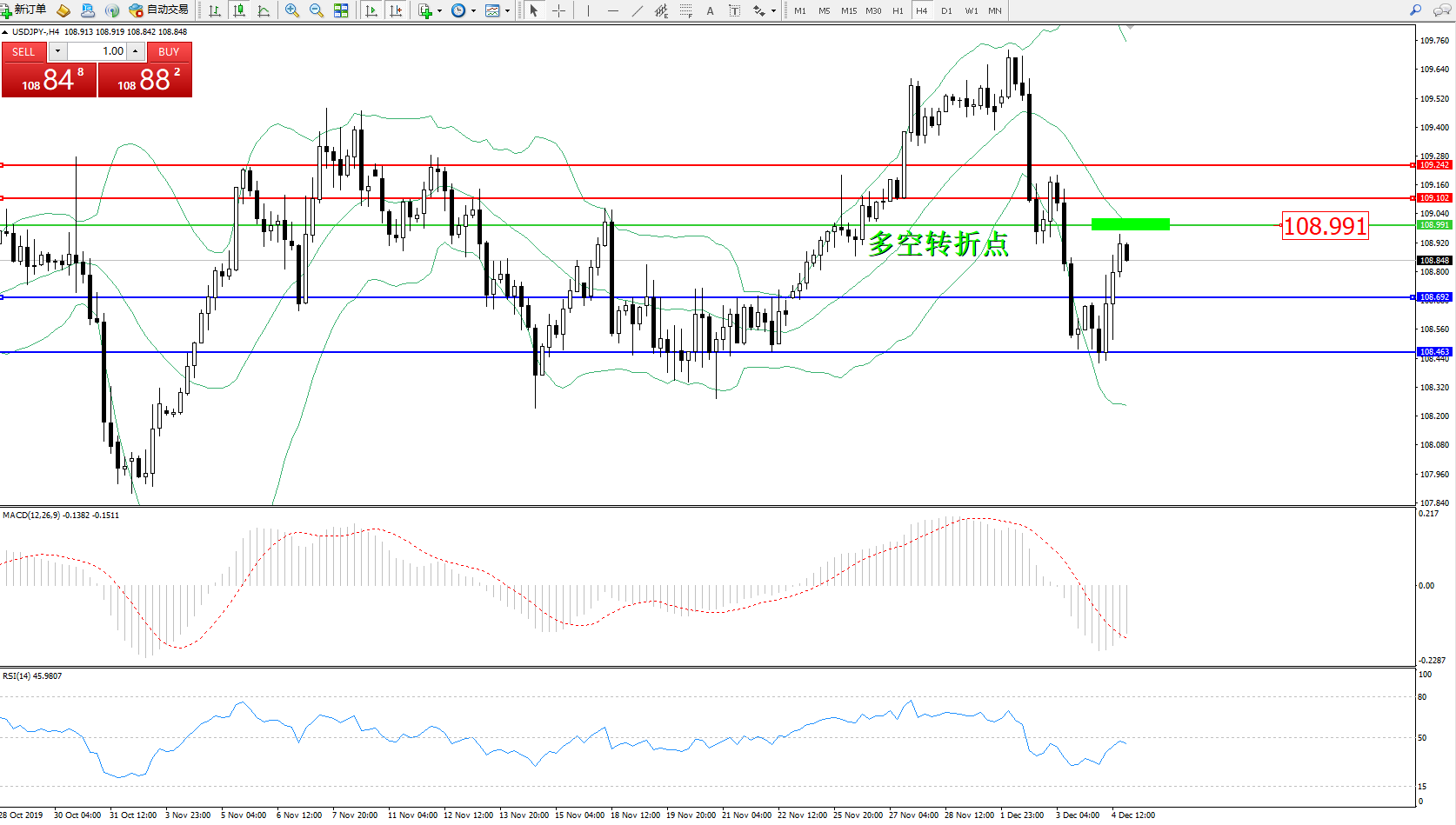 交易策略:108.991下方看跌,目标108.692108.463