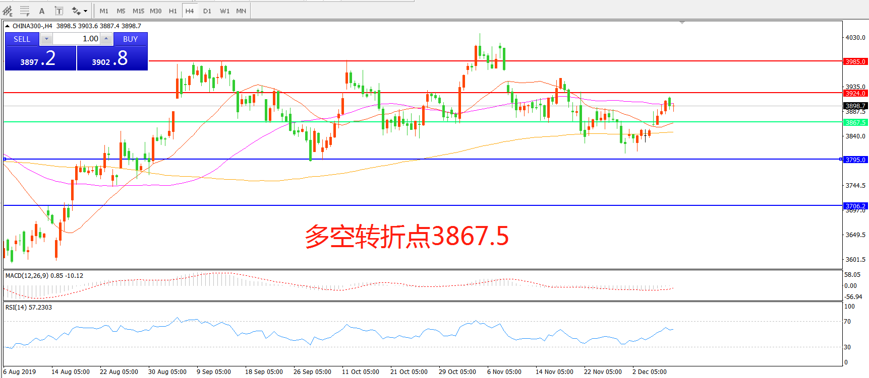 4小时图看,沪深300阳线维持窄幅震荡,整体波幅较小,均线系统走平,MACD绿柱缩短,RSI指标向上,日内震荡上行概率较大。