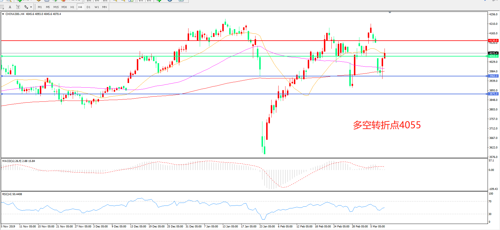 4小时图看,沪深300以200周期均线为依托,震荡反弹,短期走势回暖,均线系统走平,MACD红柱增加,RSI指标向上,日内延续上行概率较大。