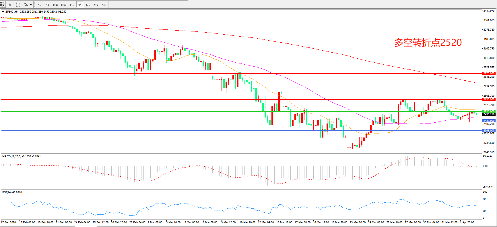 4小时图看,标普500维持窄幅震荡,整体波幅不大,55周期均线成为短期支撑,MACD红柱减少,绿柱增加,RSI指标走平,日内延续震荡概率较大。