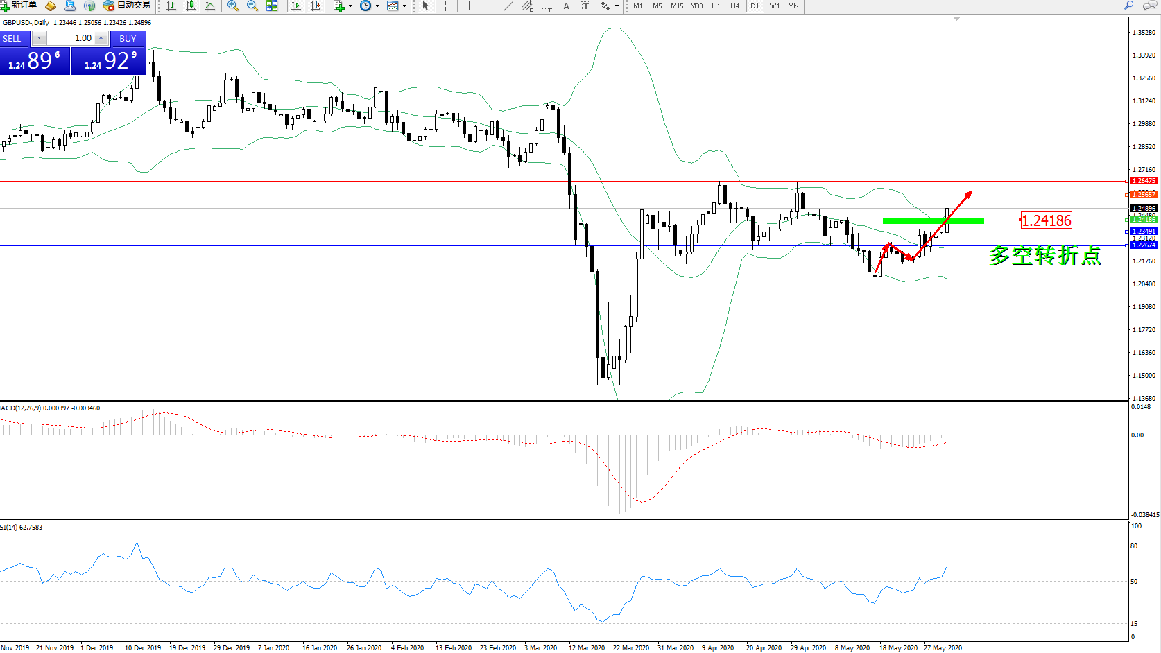 交易策略:1.24186上方看涨,目标1.25657、1.26475