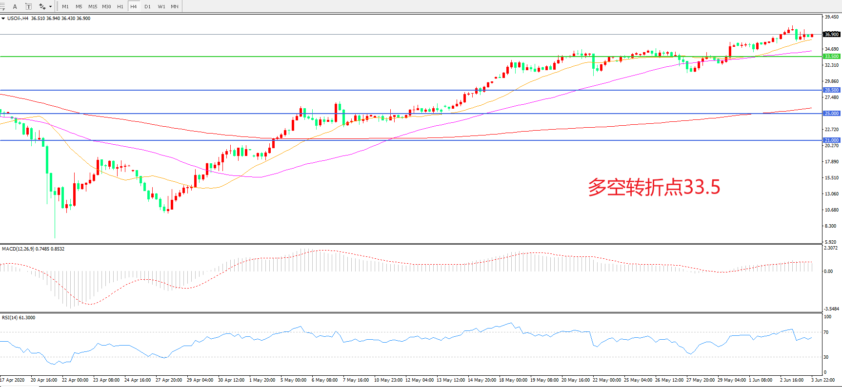 周三(6月3日),美国能源信息署公布数据显示。EIA原油库存意外减少207.70万桶,好于市场预期,但OPEC会议的召开突然传来变数,美国WTI原油震荡下行,收报36.79美元/桶。目前油价的反弹主要还是受益于产油国的大规模减产,短期涨势暂缓后,需要需求方面出现更多的利好才能进一步走高。