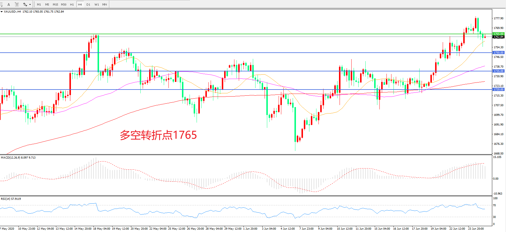 周三(6月24日),市场避险情绪重燃,金价一度触及1779.10美元/盎司,创八年新高,随后美股大跌,流动性危机再次冲击金价,现货黄金震荡回落,收报1765美元/盎司。在新冠感染病例不断增加的情况下,全球经济复苏前景悲观,美国打算对价值31亿美元的英国和欧盟进口商品征收关税,加剧了地缘政治风险,迫使投资者寻求避险。