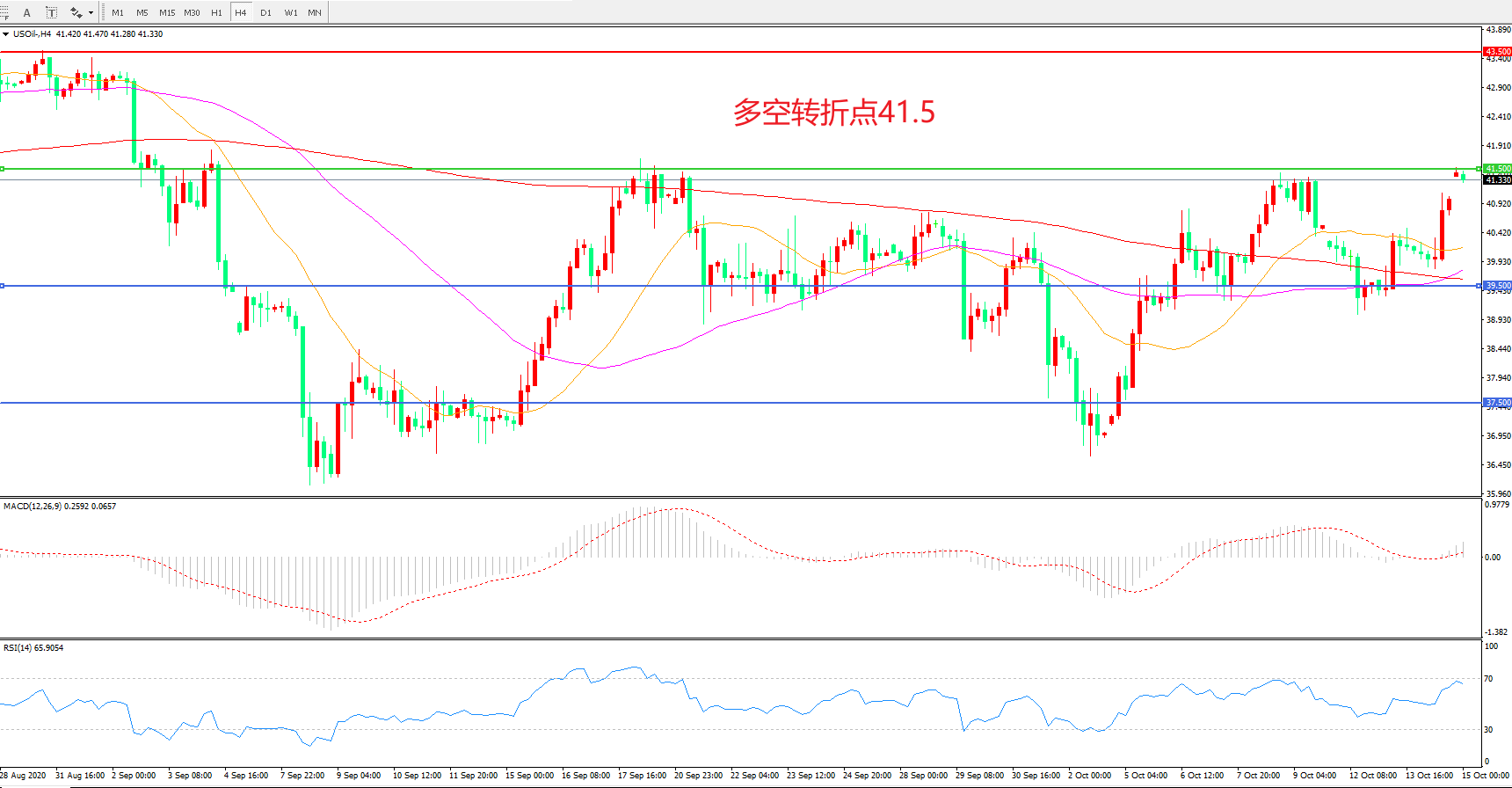 4小时图看,油价以55均线为依托大幅拉升,短期走势有所回暖,41.5成为短期多空分水岭,均线系统走平,MACD红柱增加,RSI指标走平,日内延续震荡概率较大。