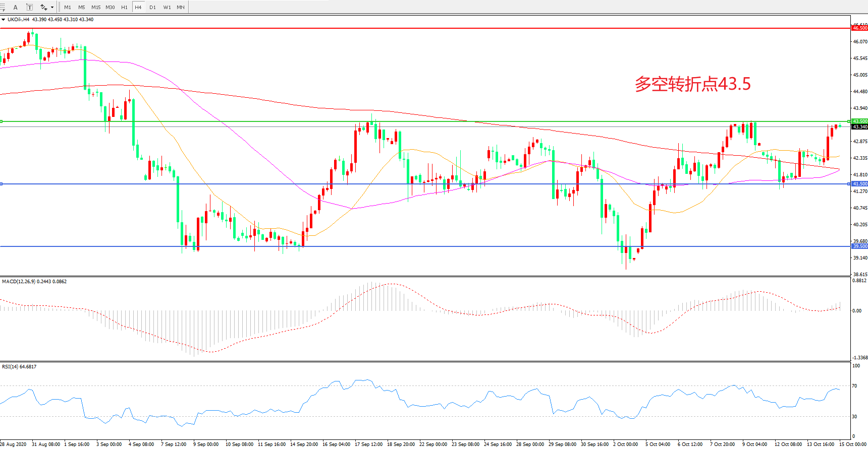 周三(10月14日),沙特官方媒体周三称,沙特王储萨勒曼与俄罗斯总统普京周二通电话,两人 一致认同所有OPEC+协议产油国继续合作及遵守减产协议的重要性,布伦特原油受到提振,大幅上行后收报43.33美元/桶。