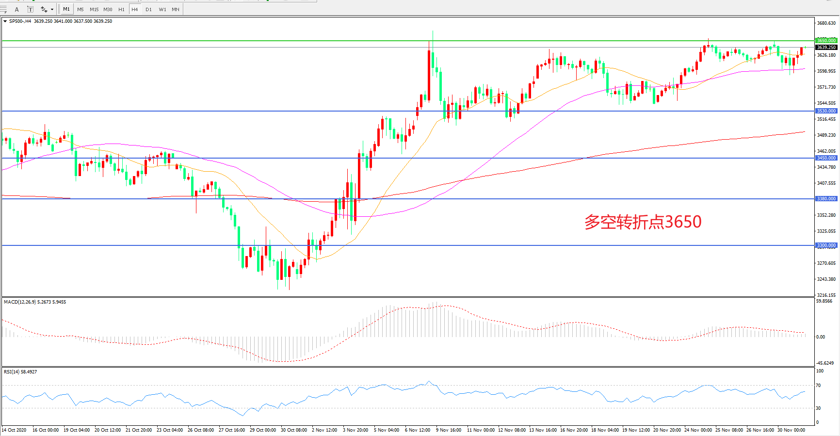4小时图看,标普500延续窄幅震荡,整体波幅不大,3650成为短期多空分水岭,21周期均线成为短期支撑, MACD红柱增加,RSI指标向上,日内延续上行概率较大。