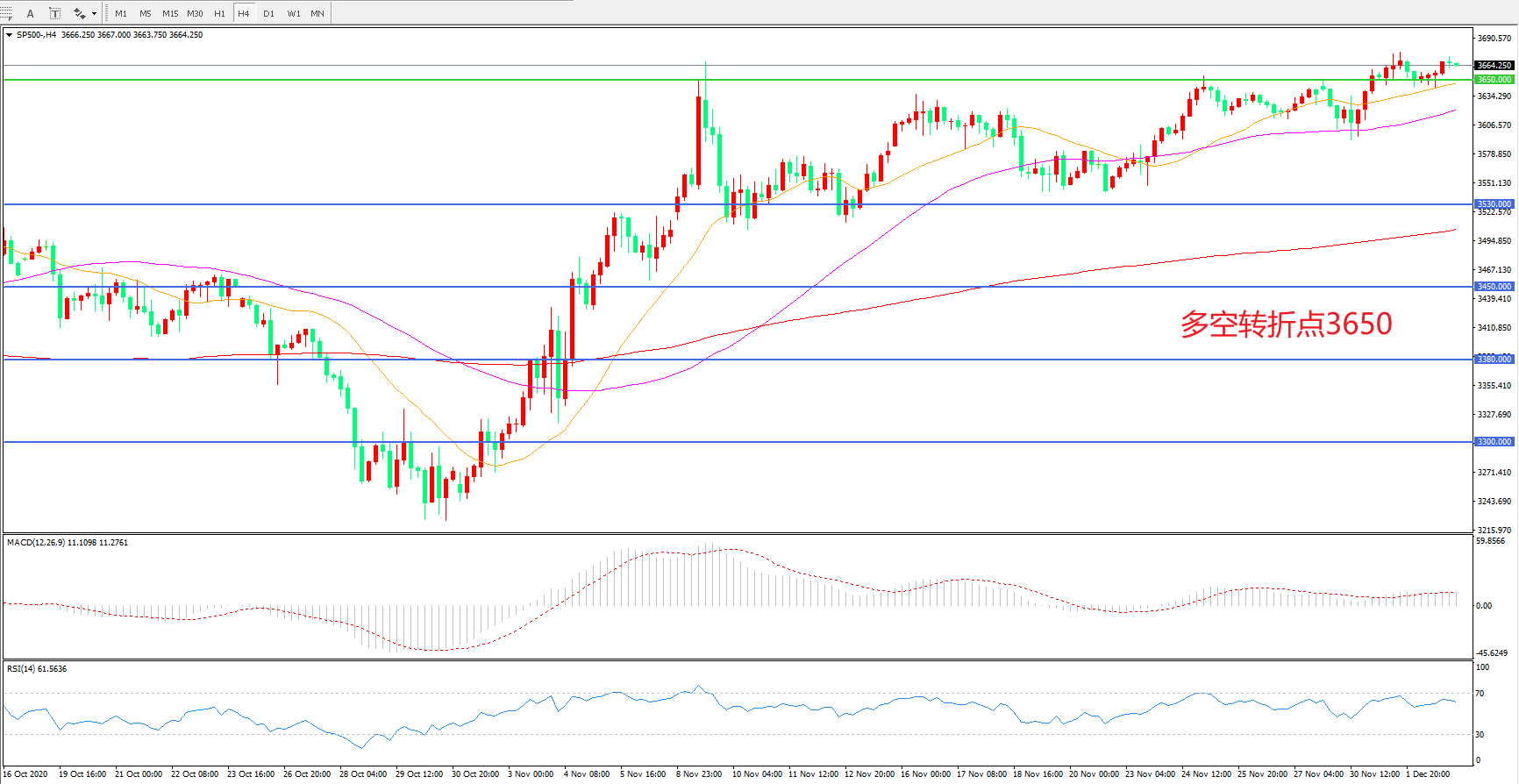 4小时图看,标普500震荡突破,上行趋势稳健,3650成为短期多空分水岭,21周期均线成为短期支撑, MACD红柱增加,RSI指标向上,日内延续上行概率较大。