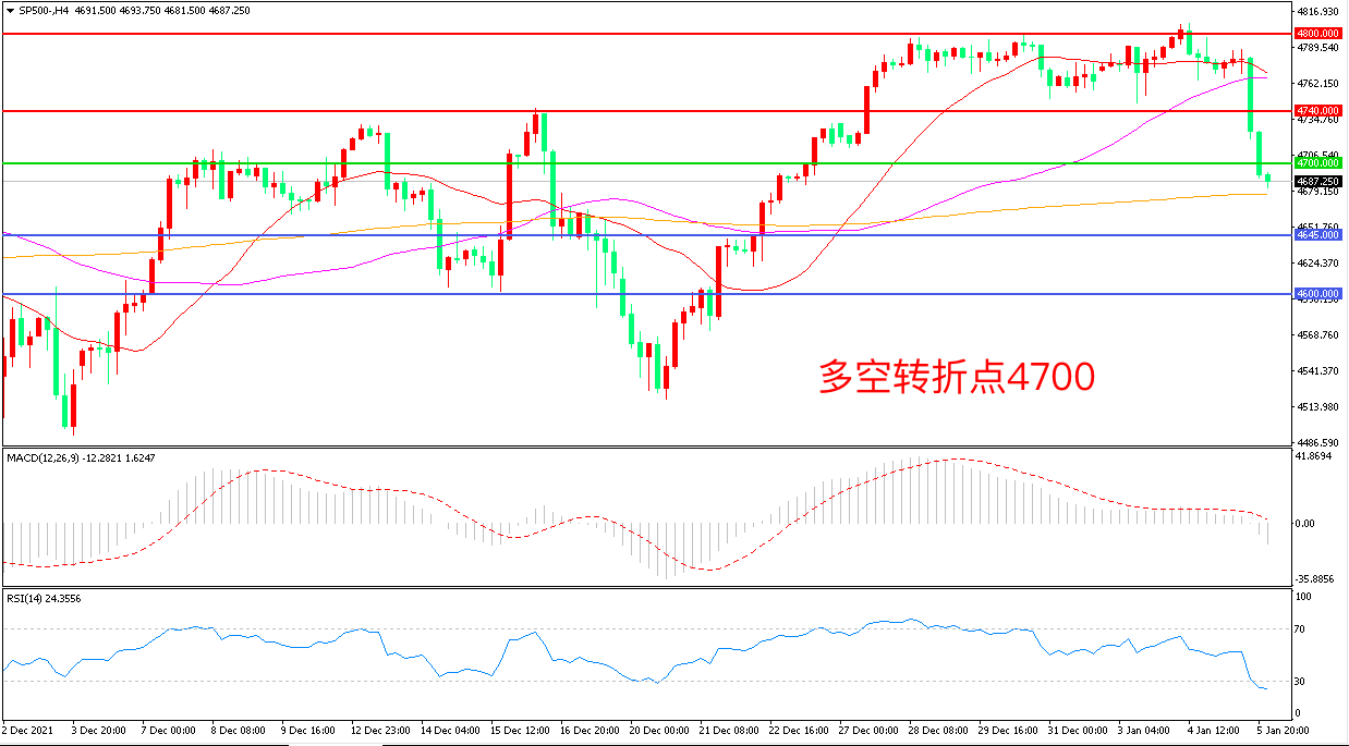 周三(1月5日),美联储会议纪要显示,缩表速度可能超过之前一轮缩表周期,部分美联储官员希望在加息后不久开始缩表,美股惨遭当头一棒,标普500长阴下破,收报4691.50点。此外有“小非农”之称的ADP就业人数加80.7万人 大幅超出预期,如果周五的非农数据与此表现一致,可能引发市场的新一轮下跌。