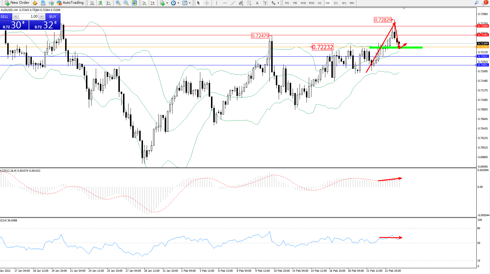 交易策略:0.72232上方看涨,目标0.72492、0.72689