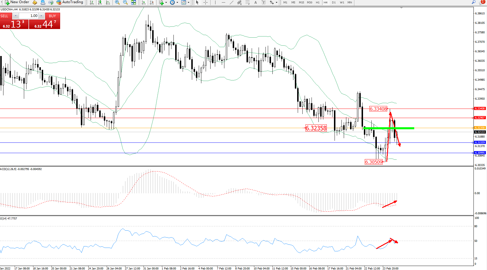 技术点评:空头动力延续布林带指标下行趋势通道不断震荡下挫,低位抵达6.30509附近节点得到支撑快速拉升,短期触及6.33408高位后遇阻再度下挫,整体下行趋势态势良好,短期依旧有进一步向下移动态势,布林带指标呈缓慢张口走势持续中,MACD低位多头动力维持整理缓慢上移,RSI指标低位多头动力维持震荡上移至50均衡线附近开始徘徊;