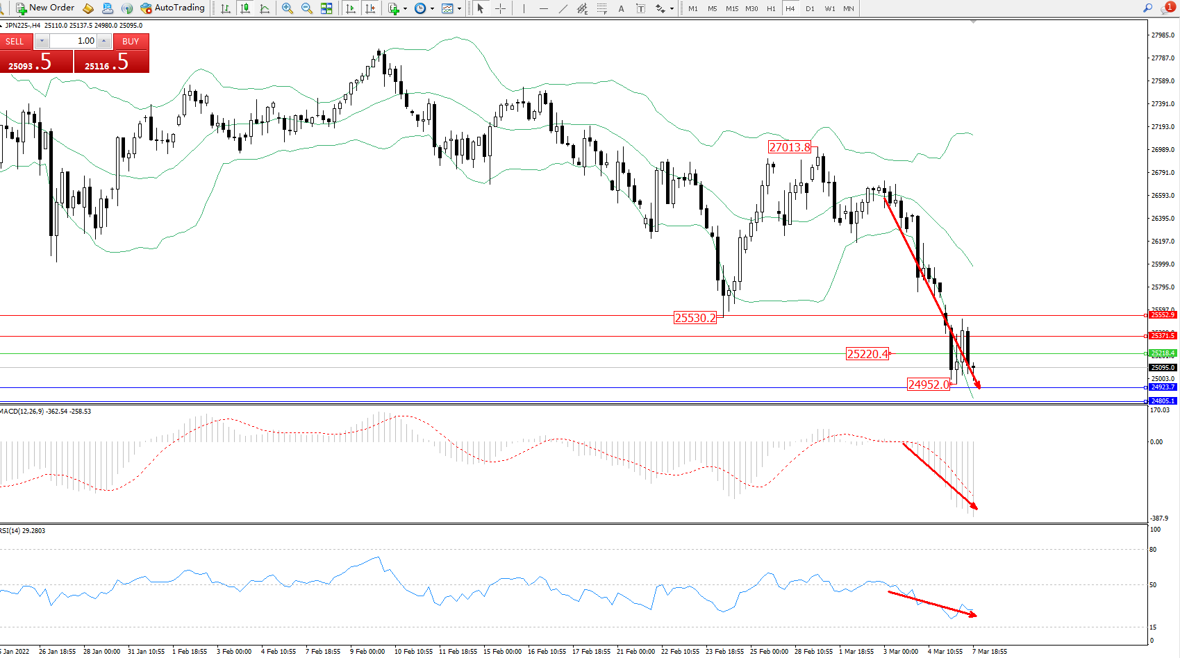 日经225指数3月7日(周一)收盘下跌733.97点,跌幅2.82%,报25251.50点。日本经济产业大臣:目前预计对俄罗斯的经济制裁不会对液化天然气的稳定供应造成影响。国内公用事业、天然气供应商有2-3周的液化天然气库存。(被问及在俄罗斯受制裁下如何进行能源采购)日本会与G7步调一致。