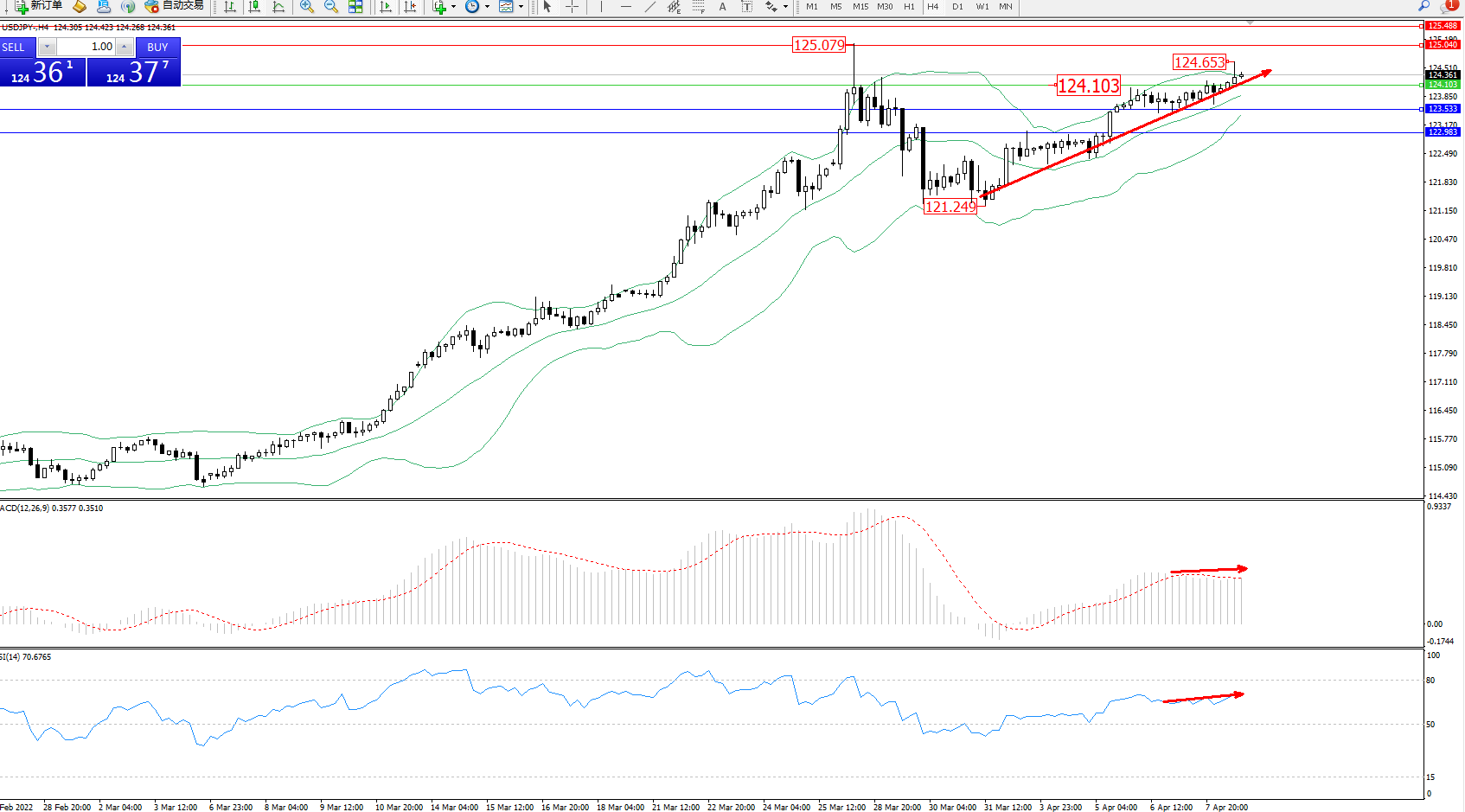 交易策略:124.103上方看涨,目标125.040、125.488