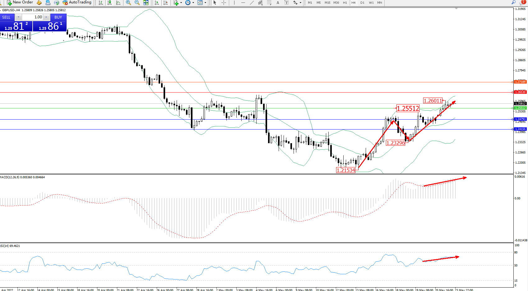 交易策略:1.25512上方看涨,目标1.26530、1.27189