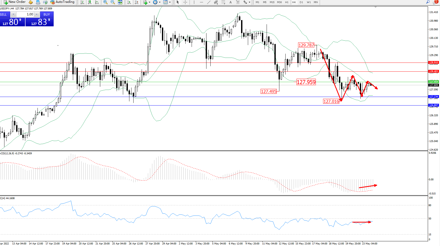 技术点评:空头力度延续布林带指标中下轨区间持续震荡下行,低位抵达127.016附近节点后开始窄幅整理平移,触及布林带指标中轨附近节点后开始徘徊,短期空头下行动力开始减弱,布林带指标呈收口走势持续中,MACD指标处于0轴线下方空头区域维持窄徘徊,RSI指标处于50均衡线下侧弱势整理中;