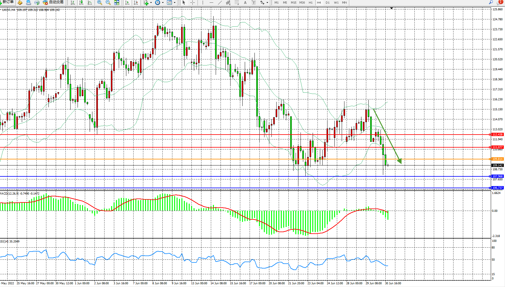 4小时图看:空头动力延续布林带指标下轨附近持续震荡下挫,短期跌破下轨附近节点后有继续下行态势,布林带指标呈张口走势持续中,MACD指标处于0轴线下侧徘徊,RSI指标处于50均衡线下侧整理下行;