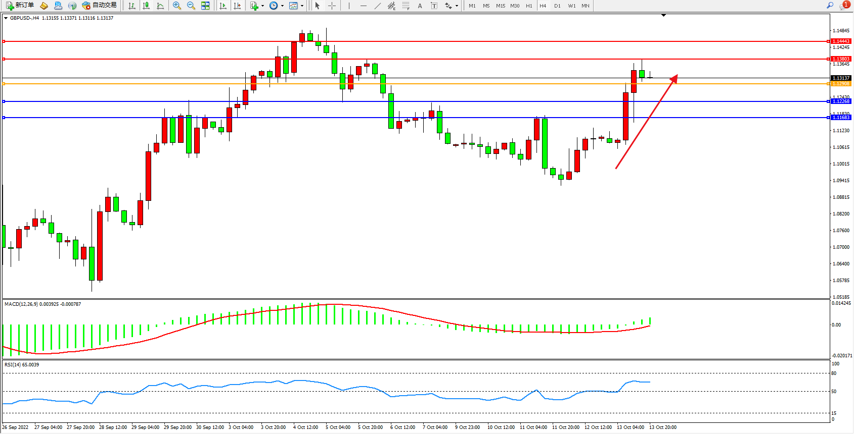 4小时图看:高位窄幅震荡后急速拉升上扬,短期看涨情绪升温,市场多头涌现,MACD指标处于0轴线市场徘徊,RSI指标处于多头区域维持整理平移;