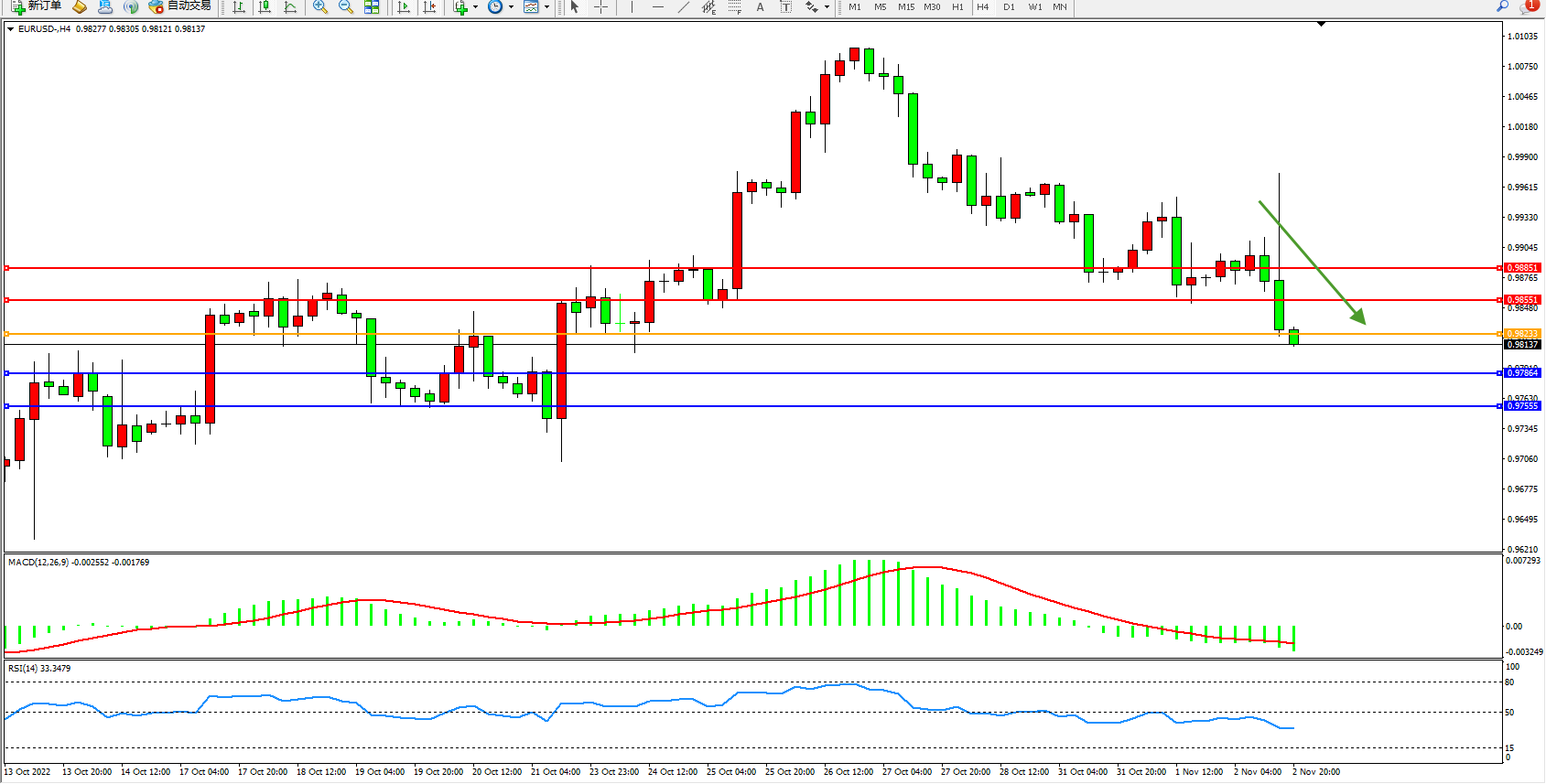 欧元兑美元维持0.98137附近震荡,10月份欧元区制造业PMI降至46.4,这是自新冠肺炎导致的经济衰退高峰期以来的最弱数据。需求急剧下降仍是一个关键拖累因素,因为通胀持续攀升,且不确定性很高。