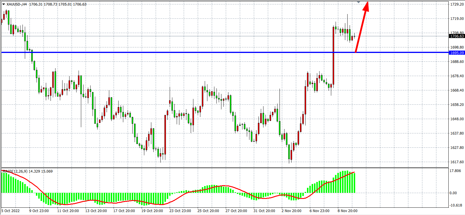 4小时图看,金价最高涨至1722后再度回落至1700附近,但MACD于零轴之上维持强劲放量状态,预示多头动能仍有进一步走强空间,前期阻力位1680已转换为强支撑,同时短支撑已集中于1695附近,日内在该位支撑继续看涨,目标1720-1735。