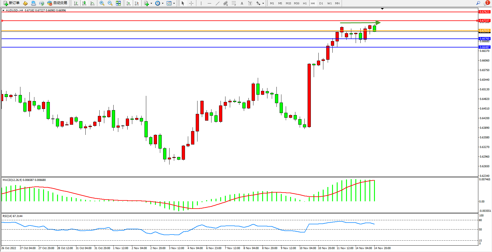备选策略:0.67025上方看涨,目标0.67337、0.67623