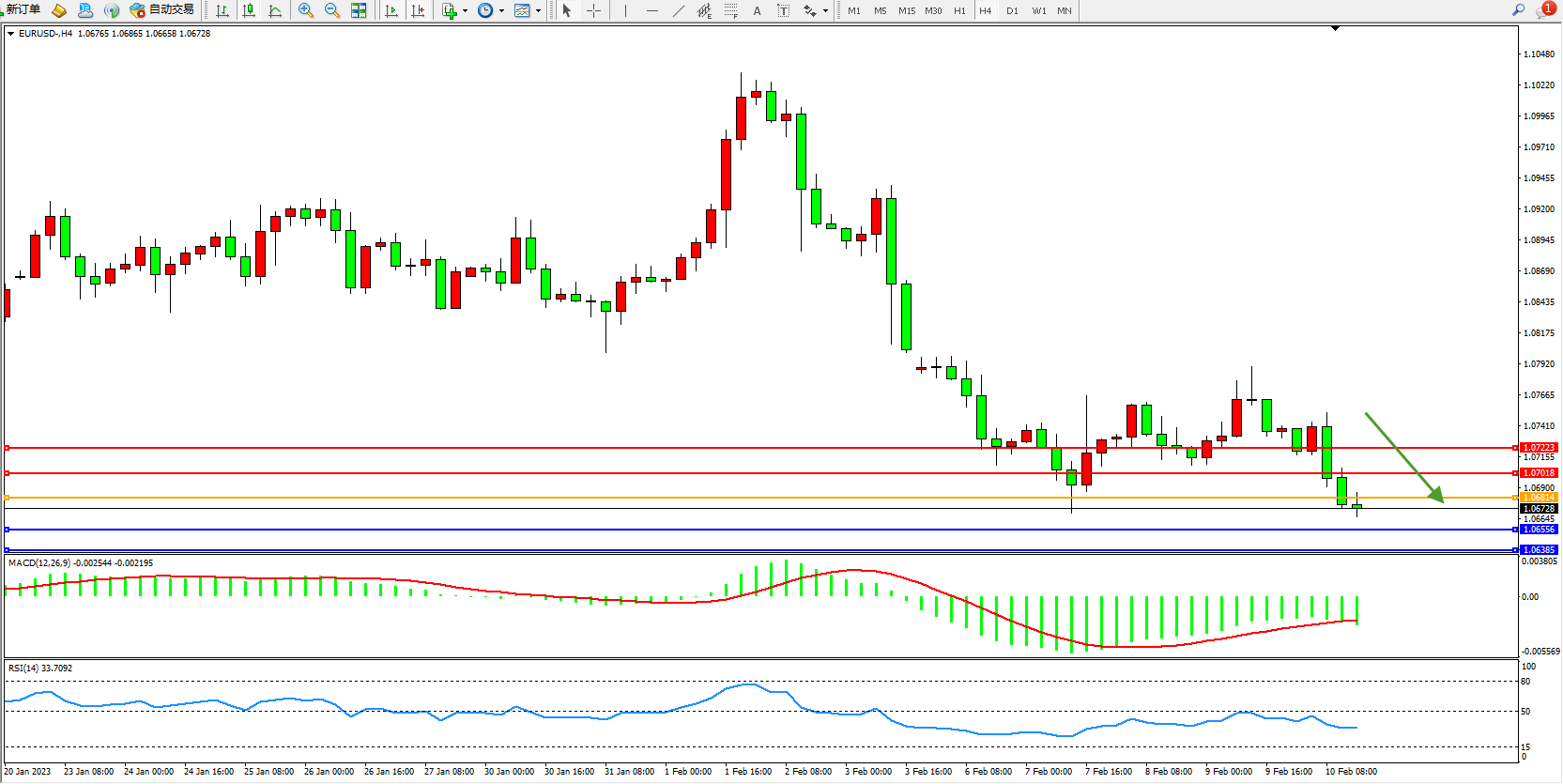 欧元美元EURUSD—4小时K线图显示: