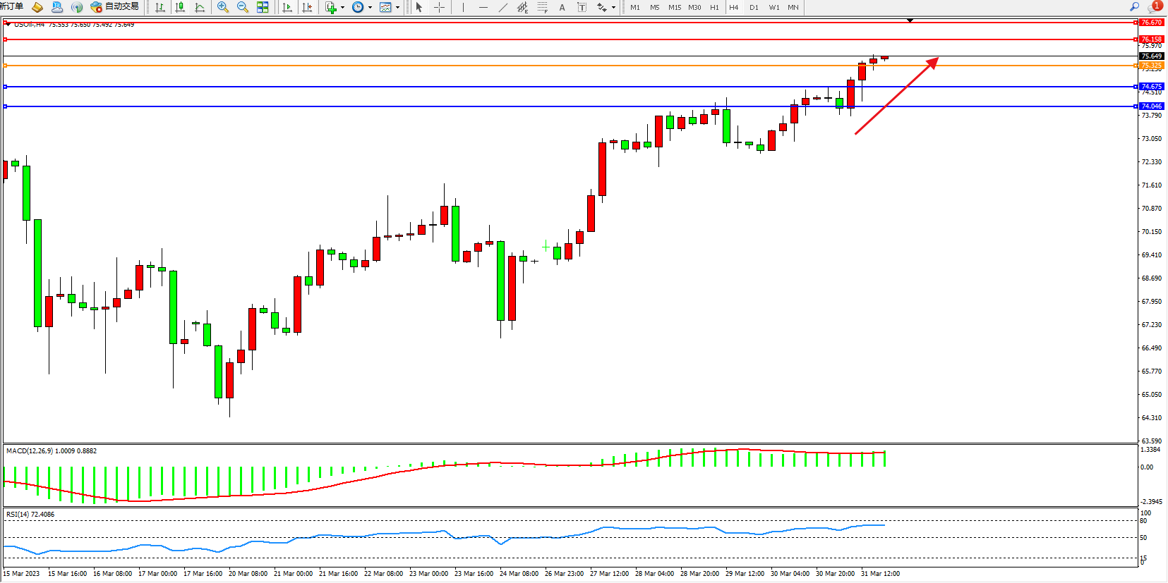 4小时图看:多头动力高位攀升,市场看涨情绪依旧,短期有继续向上移动态势,MACD指标处于多头区域维持整理,RSI指标处于多头区域高位徘徊;